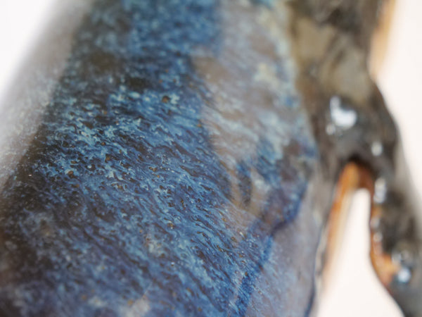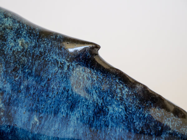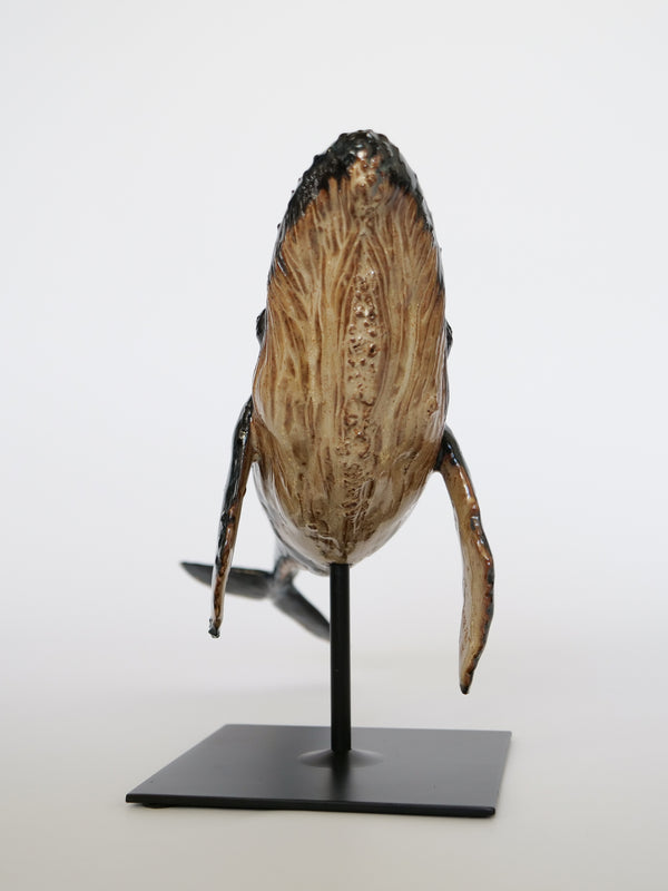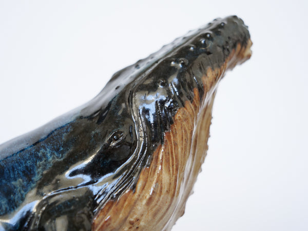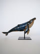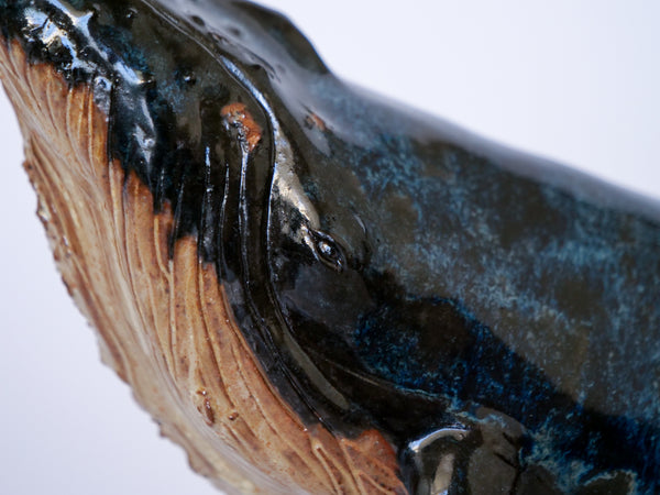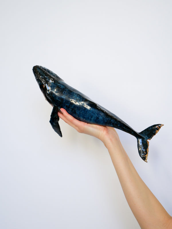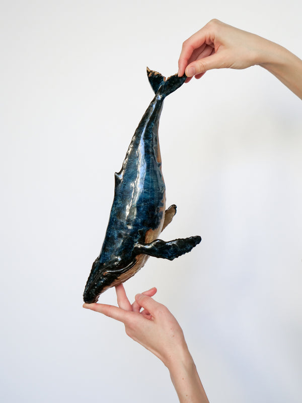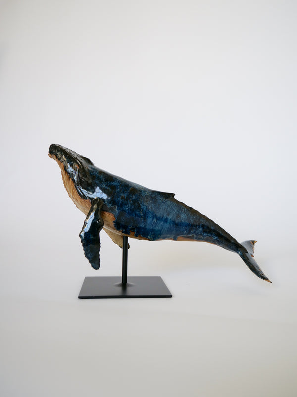 Large blue whale, glossy. Made of black porcelain. Comes with a stand.